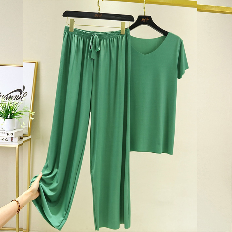O tecido todo feito em modal (fibra raion modificada) é o único que garante elasticidade máxima, leveza e caimento perfeito em seu corpo. O design com gola V proporciona muita elegância e frescor, já o cós alto da calça proporciona maior conforto e elegância, seguindo a tendencia da moda para este verão de 2022!